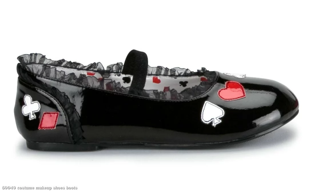 Add the perfect finishing touch to a classic fairytale ensemble this Halloween! Includes one pair of black ballet style shoes with hearts and club design on the toe and heel. Guaranteed to be the center of her friend’s attention at her next costume party!