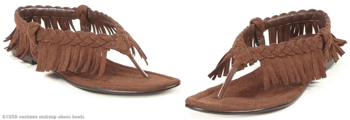 Complete your Native look for Halloween with these fringed sandals! Perfect for a Pow-Wow, these fun flats include a pair of flat brown thong sandals with fringe along the ankle.