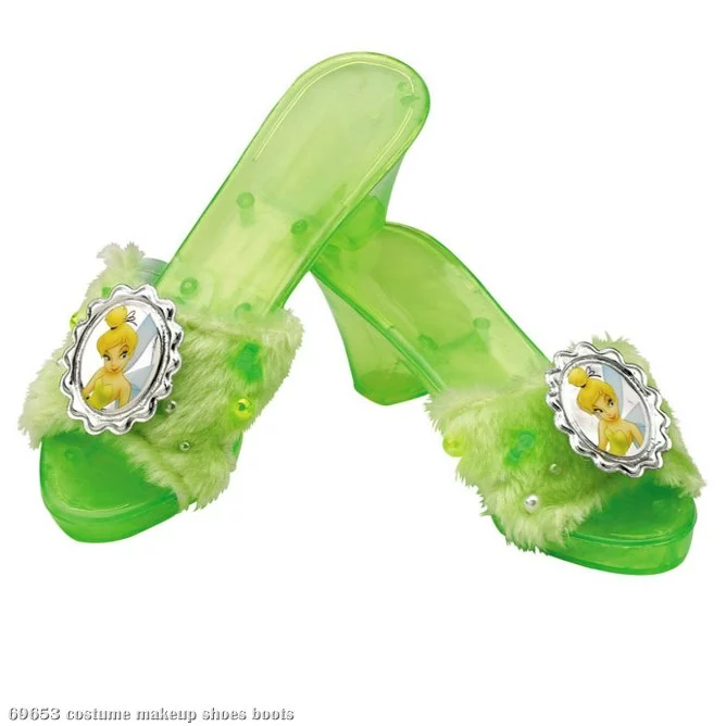 Make sure your Little Fairy’s look is complete from top to bottom with these Tinker Bell shoes! They feature a green sole and 1″ heel, and fluffy marabou strap with jewels and a Tinker Bell cameo on each foot.