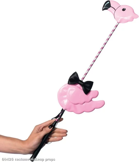 For the cruel queen with a passion for croquet, this crop is fun way to accessorize your adorable ensemble! Includes one crop featuring pink and white ribbon staff, faux leather handle and attached pink flamingo body and a black satin bow.