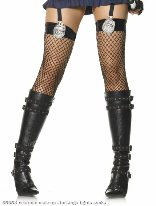 You’d better stop in the name of love, before she breaks your heart in these thigh highs. Features black industrial net stockings with black vinyl trim top and silver police badges. Now she’s ready to bring all the bad boys downtown.