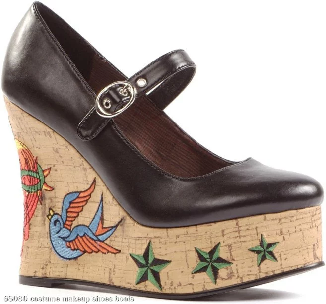 Add edgy, rockabilly style to any look with these sky-high shoes. Includes one pair of platform Mary Janes with a tattoo-printed 4-5-inch cork wedge.