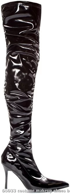 The possibilities are limitless with these sky-high boots! Includes one pair of stretchy faux-patent-leather, thigh-high boots with a ruched design and 3.5-inch heel.