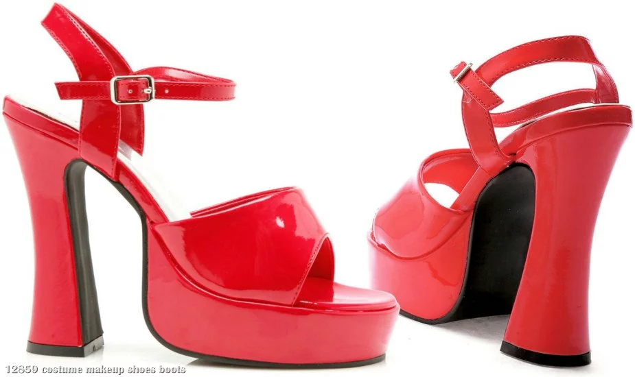 Whether you’re a sassy devil on the prowl or a sexy cupid looking for love these are the shoes for you. These sassy shiny platform sandals are red with a silver buckle, 1-1/4 inch platform and a 5 inch heel.