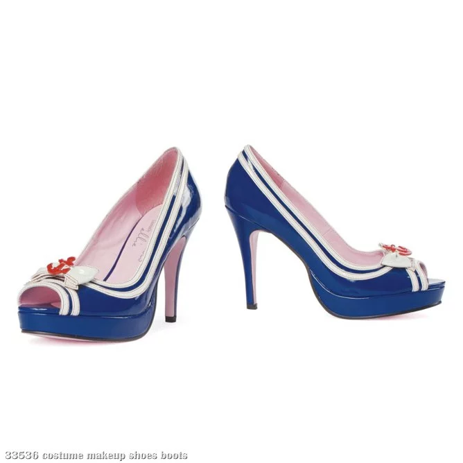 Ahoy! The Blue and White “Matey” Peep-Toe Shoes feature a 4″ heel, a bow embellishment, an anchor decoration, and a 1″ Platform sole. Whether you are an on-board beauty making waves, or a sassy lass setting sail on the high seas, these shoes add a flirty and feminine finishing touch!