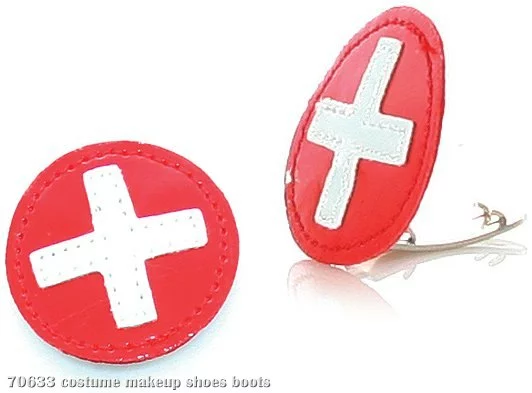 Need to add a little extra to your medically-inspired look! Perfect to clip onto any kind of shoe, these clips feature a red circle style with a white medical cross in the center and clip into place on the edge of the shoe.