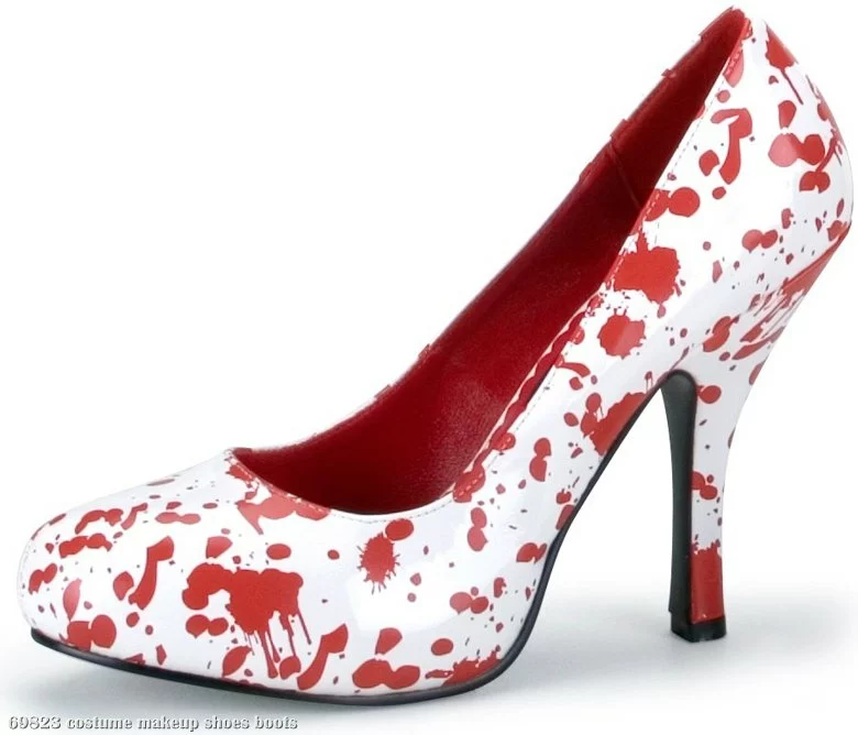 Knock’em dead this Halloween with these sexy pumps! Whether your a zombie prom date with a taste for flesh or a psycho nurse these are the shoes for you! Includes one pair of white 5″ high heel pumps with red blood splatter print throughout. Guaranteed to stomp out the competition!