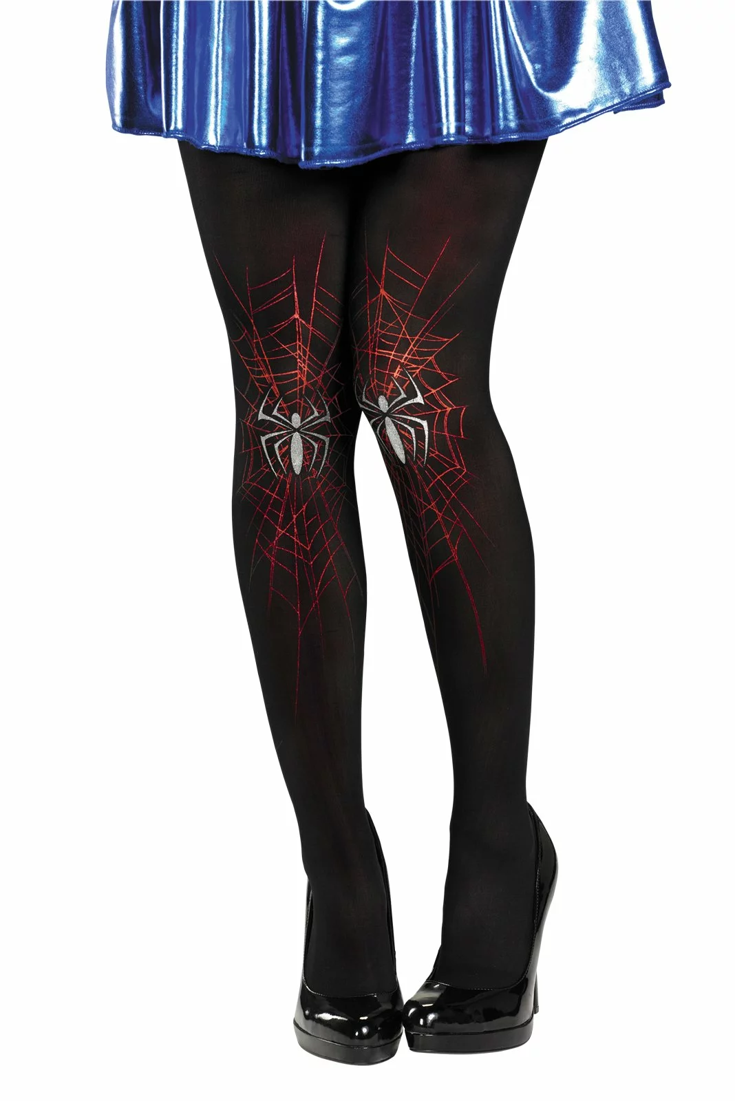 Soar to new heights when you complete your look with the Spider-Girl Adult Pantyhose. This item includes one pair of pantyhose with glittery spider and spider web design.