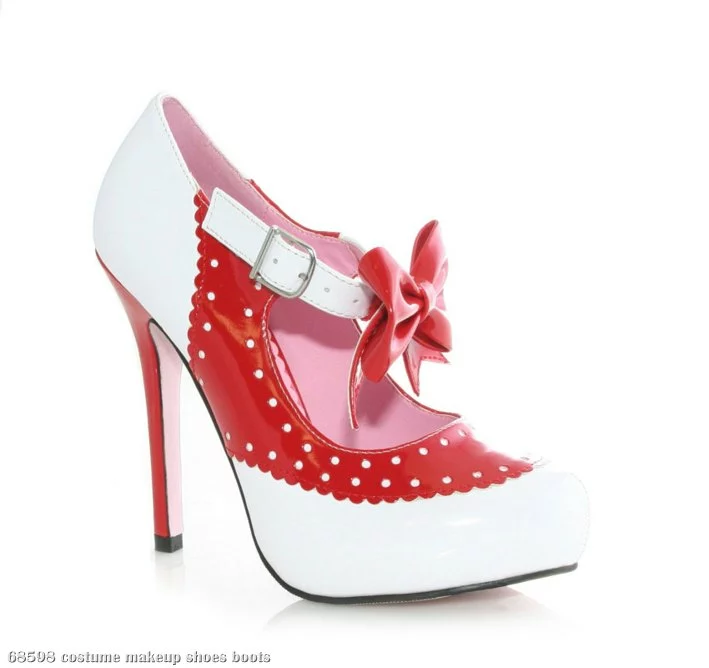 These classically cute shoes may be called babydolls, but they’re anything but. These red-and-white Sweeties combine saddle shoe styling with a 5-inch heel and removable patent bow. Perfect for school girls and sock hop sweethearts alike!