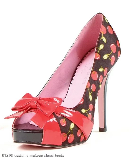The Tart Adult Shoes feature a 4″ Satin Cherry Print Open-Toe Pump with a 1″ Concealed Platform and a red patent bow. They’re an adorable accessory that will complete your ravishing retro look and get you from one party to another in style!