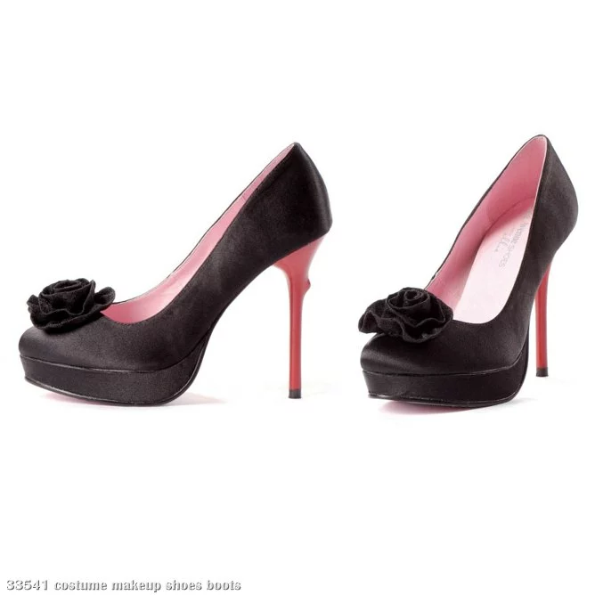 The Black Satin “Thorn” Shoes feature a 4″ red enamel “thorn” heel (heel is designed to emulate a flower stem with a thorn), a flower embellishment, and a 1″ Platform sole. Whether you are a Victorian vamp seductively searching for your next love-bitten victim, or a sexy senorita shaking your hips to the soft sound of a steel guitar, these shoes are a sexy finishing touch.