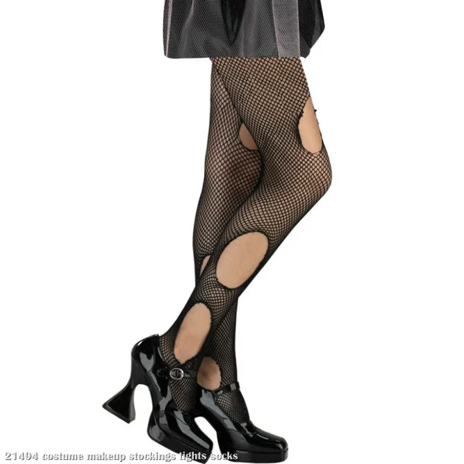 Perfect for almost any rough look this Halloween! Includes a pair of black fishnet stockings that features torn spots on the sides and front.